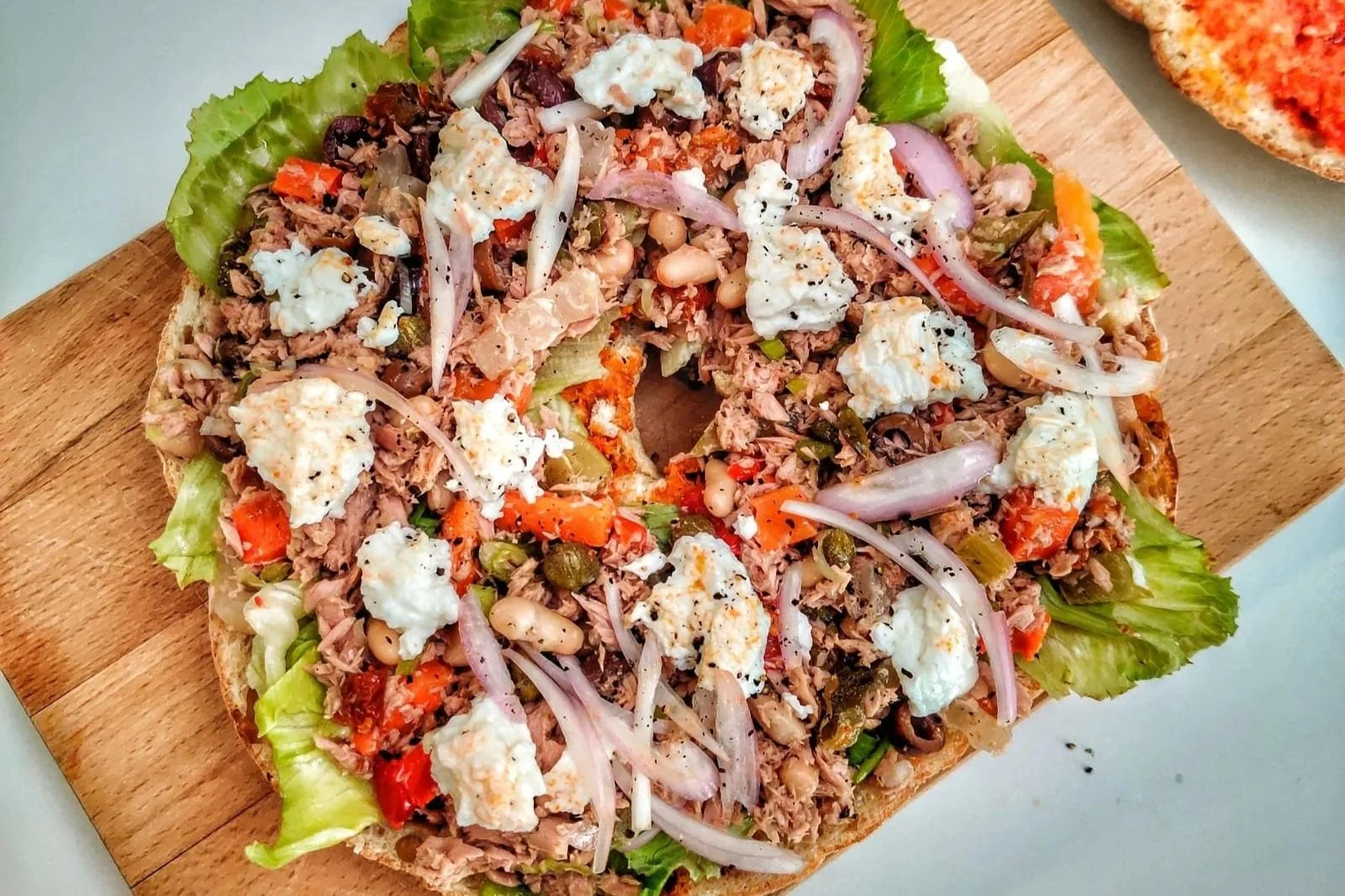 Fresh Ftira (Maltese traditional bread), kunserva (tomato paste), tuna, capers, olives, ġbejniet cheese, pickled vegetables (giardiniera), red onions, tomatoes, letucce, cannellini beans in fresh herbs.