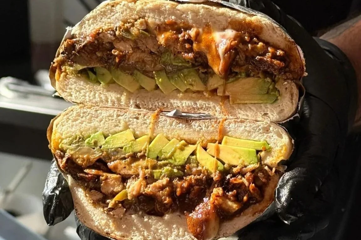 Mexican sandwich. Handmade smoked chicken, avocado, handmade Oaxaca cheese, handmade mole sauce, jalapenos and crispy onions.